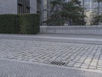 A view of a modern office building in Berlin, Germany. The grey urban landscape with asphalt roads and cobblestone curbs reflects the city's architecture. The business district is surrounded by trees and vegetation, creating a vibrant atmosphere.