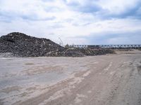 Industrial urban landscape in Germany. Construction area with piles of rubble and an overpass in the background. Coastal city with waves crashing against the shore. A glimpse into the dynamic city life of Europe.