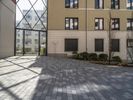 A panoramic view of a modern residential neighborhood in Berlin, Germany. The straight road lined with buildings and vegetation creates a picturesque urban landscape. The clear sky adds to the city's vibrant atmosphere.