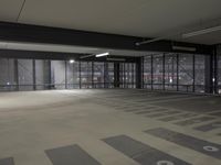 This is an image of a dark street in Berlin, Germany at night. The modern architecture of the city is showcased through the concrete buildings and structures with glass windows and facades. The road and parking lot are made of asphalt and lined with artificial lights. The city's public transportation system is evident with the presence of a parking deck and garage. The photo captures the urban atmosphere of Berlin, a metropolitan area in Europe known for its contemporary architecture and vibrant public spaces.