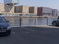 A clear sky frames the modern architecture of Berlin's cityscape. Cars parked near a bridge reflect the urban landscape. The open space and waterfront add to the city's charm.