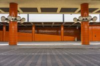 A modern architecture parking garage in Berlin, Germany. The multicolored building stands out in the urban landscape. The two large pillars, holding speakers, add an artistic touch. Brick pavers provide a stylish flooring option.