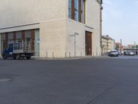 A sunny day in Berlin, Germany showcasing the city's modern architecture. Cars parked on the street in front of a tan building with large windows. The urban landscape captures the essence of Europe.