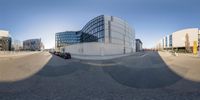 A snapshot of a busy street intersection in Berlin's business district. Modern architecture and office buildings line the road, with cars passing by. The concrete and asphalt surfaces create a sleek urban landscape.