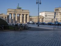 This is an image of the iconic Brandenburg Gate in Berlin, Germany. The architecture of the gate is a representation of the city's history and culture. The road leading up to the gate is lined with historic buildings, creating a vibrant urban atmosphere. The town square in front of the gate serves as a public space where locals and tourists gather. Cobblestone streets add to the charm of the area. On a clear day, the gate and surrounding buildings bask in the sunlight. This photo captures the essence of Berlin - a city rich in history and architectural beauty.