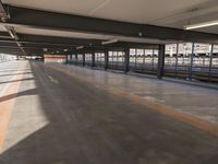 This image depicts an empty metro platform at an airport in Berlin, Germany. The architecture of the subway station is modern and urban, with concrete flooring and walkways. The platform is lined with vehicles and trains, highlighting the city's efficient transportation infrastructure. The scene is set during the day, with shadows cast by the buildings and the line of vehicles extending towards the parking garage and parking lot. This photo captures the bustling atmosphere of a public space in Berlin, showcasing the city's urban and European charm.