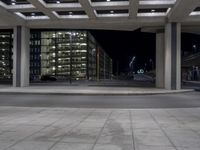 a very large modern office building lit up at night by the sidewalk area outside of the building