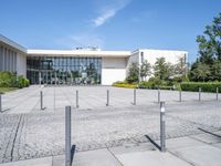 A view of modern architecture in Berlin, Germany. The clear sky highlights the sleek office buildings in the financial district. Cobblestone roads lead to the university campus and surrounding business district. A perfect day in Europe's architectural hub.