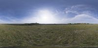 A sunny day in Brandenburg, Germany, showcasing vast open spaces of green grass and nature. The sun visible amidst scattered clouds adds to the picturesque landscape.
