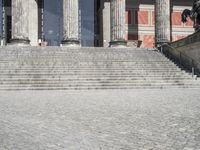 The grand entrance to the Altes Museum in Berlin, Germany showcases classic architecture and historic design. The cobblestone surface leads visitors to the open space with statues and large columns. A must-visit tourist attraction in the city.