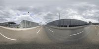 Aerial view of a modern architecture business district in Berlin, Germany. The straight road leads to a high-rise building with glass facades. The airport is surrounded by industrial infrastructure and public spaces. A metropolitan area with a mix of residential and nonbuilding structures.