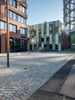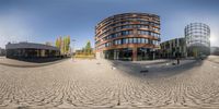 An unconventional view of modern architecture in Berlin, Germany. The curved building with two doors and windows creates a unique visual. The open space and cobblestone road add to the urban charm of the city. Clear skies and contrails complete the picture of a perfect European day.