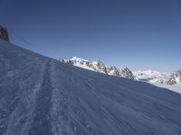 a person skiing down a snowy slope on a sunny day's day near mountains