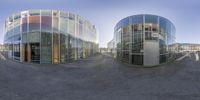 A modern glass building in Berlin, Germany, with a mix of residential and commercial properties. The facade reflects the clear sky and the city life. The sunlight casts hard shadows on the glass walls, creating a striking urban design.