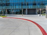A glimpse of urban life in Los Angeles, California. The modern architecture of the glass building stands against the clear sky. A red fire hydrant adds a pop of color on the concrete street, a reflection of the city's urban design.