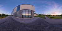 the spherical photo shows the building that looks like a house and its reflection on the glass