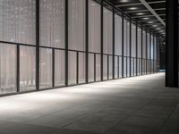 This image captures the modern architecture and urban design of Berlin, Germany. The hallway, with its sheered walls and multiple windows, provides a symmetrical and glass-filled view. Tall buildings and artificial lights can be seen outside, representing the city's bustling business and financial district. The dark night sky adds a dramatic element to the scene. This photo showcases the contemporary and vibrant atmosphere of Berlin's city life, with its mix of galleries, museums, hotels, and office buildings.