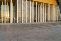An iconic modern architecture of a business district, featuring large columns and a glass facade. The sunrise reflects off the glass windows, creating a stunning urban symphony. A perfect representation of city life.