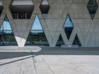 A skateboard sits in front of urban structures in Kaohsiung, Taiwan. The buildings reflect the daylight on their glass surfaces, creating hard shadows. The city's vibrant art center is a testament to Taiwan's urban design.
