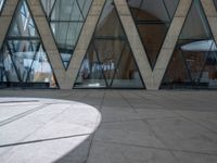 an empty walkway outside a large building with glass panels on the walls and many windows