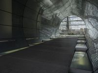 an escalator in a building with glass walls and metal roofing is viewed by several people