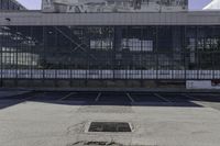 Empty Parking Lot in Toronto with Glass-Walled Warehouse
