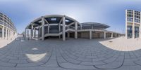 A modern architectural marvel in the heart of Berlin, Germany. This mixed-use property boasts a stunning facade of glass walls and windows, providing a 360-degree view of the bustling city. The clear sky reflects off the sleek surfaces, creating a mesmerizing top-down perspective.