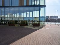 A glassy building with a clock outside, surrounded by cobblestone courtyard. People walk by in this urban Holland cityscape. Clear sky enhances the modern architecture of this European city.