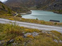 A gloomy day in Austria, with grey skies and rugged mountainous landscape. A dirt road winds through the highlands, surrounded by vegetation and fluvial landforms of streams. A dam creates a lake, providing water resources in this natural environment.