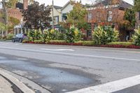 A gloomy autumn day in Toronto's residential area. Classic architecture mixed with suburban infrastructure. Busy street lined with trees and shrubs, painted white. Grey skies create a somber atmosphere.