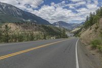 a large road with two yellow stripes in the middle of it surrounded by trees and mountains