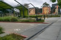 A gloomy day in the business district of Los Angeles, California. Modern architecture, office buildings, and urban design create a stark and grey cityscape. Streets lined with curbs and walkways provide a glimpse of bustling city life.