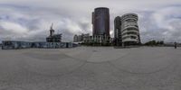 Gloomy grey sky looms over a business district in the city. Modern architecture of high-rise buildings and office towers dominate the skyline. Open spaces and plazas provide a contrast to the concrete surfaces. A glimpse into urban design and city life.