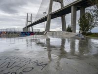This image captures the urban landscape of Lisbon, Portugal on a gloomy day. The grey sky sets a moody tone and contrasts with the city's architecture and concrete surfaces. The graffiti wall adds a touch of urban art to the scene. In the foreground, a skatepark and bridge can be seen, showcasing the city's open spaces and underpasses. Surrounding the cityscape are trees and vegetation, adding a touch of nature to the urban design. The image captures the essence of city life in Lisbon, with its blend of architecture, water, and graffiti.