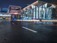 This stock photo showcases a gloomy cityscape in Guangzhou, China. The image features a modern architecture, specifically an office building and a cafe with neon lights illuminating the street. The asphalt road and wet surface reflect the artificial lights, creating a futuristic and urban atmosphere. The grey sky and rain add to the overall gloomy ambiance. The image highlights the vibrant city life and urban design of Guangzhou, a metropolitan area in Guangdong province, China.