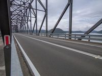 A gloomy day on a cable-stayed bridge, with a truck traveling over water and land. The grey sky adds to the gloom, while mountains provide a scenic backdrop.