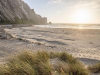 a beach with people sitting and walking near water at sunset under a mountain, rocks