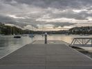A gloomy dawn on the coast, with a grey sky reflecting in the calm waters of the river. The boat dock stands out against the urban landscape, while the bridge in the distance adds to the city's profile.