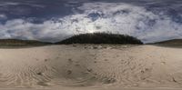 a photograph of a sand and trees area under a cloudy sky and clouds above it