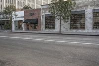 Gloomy dawn in Los Angeles, California. An empty suburban street lined with classic white buildings and storefronts. Grey sky sets the mood for a quiet city waking up. The stillness of dawn in West Hollywood.