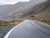 A gloomy day in Europe, with a grey sky and rain falling over the Timmelsjoch landscape. The wet asphalt road contrasts with the majestic mountains and nature surrounding it.