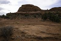 A gloomy day in the highlands, with a grey sky looming over the rugged mountain terrain. Clumps of grass and patches of gravel cover the rocky surface, creating a desolate landscape.