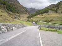 This is an image of a road going uphill in the mountains of Austria, surrounded by a stunning landscape. The road leads to a mountain pass, and a stone bridge can be seen near the mountain. The gloomy and grey sky adds to the atmosphere of the scene. The wet asphalt reflects the water droplets from the recently fallen rain. This photo captures the beauty of nature in Europe, showcasing the majestic mountains and the serenity of the surroundings.