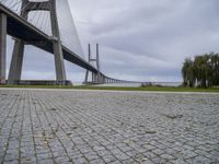 A gloomy day in Lisbon, Portugal, with a grey sky hovering above a long bridge. The brick walkway leading to an open field with trees creates a peaceful urban oasis.