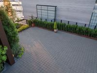 This is an image of a modern residential villa in an urban setting. The house is elevated and features modern architecture, with clean lines and open spaces. The grey sky creates a gloomy atmosphere, contrasting with the high fence and brickwork surrounding the property. The asphalt road and grassy floor add to the overall urban design. This photo captures a typical day in this residential area, showcasing the intersection of nature and modern architecture.