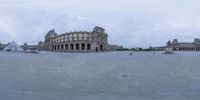 Gloomy day in Paris, France. A fish eye lens captures the grandeur of a historic building, as tourists gather in the town square. Grey sky adds to the gloom and highlights the classic architecture.
