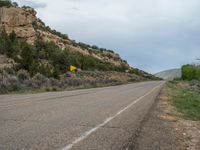 A gloomy day on a rural road in Utah, with grey skies and mountains in the background. The asphalt road cuts through the landscape, offering a glimpse of nature's beauty. One quarter of the way through Utah.