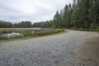 a paved road in a wooded area with pine trees in the distance and a lake near it