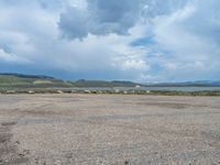 Gloomy day along the coastline of Utah. Grey sky hangs over the open space, contrasting with the gravel and dirt surfaces. The lake reflects the gloom, creating a desolate landscape.
