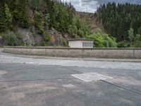 A gloomy European landscape featuring a classic architecture dam in Germany. Grey skies loom above a rural road lined with forest trees. Concrete streets contrast with nature's profile.